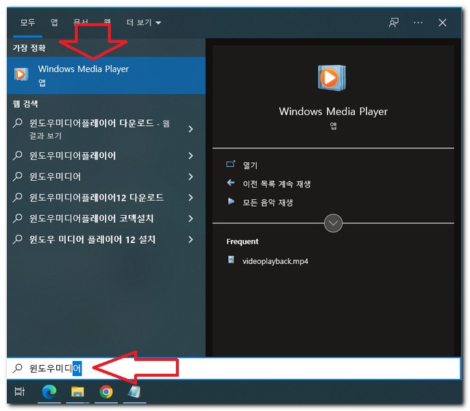윈도우 키 -> 윈도우미디어 또는 windows media 까지만 입력