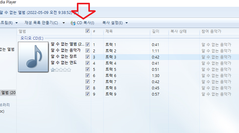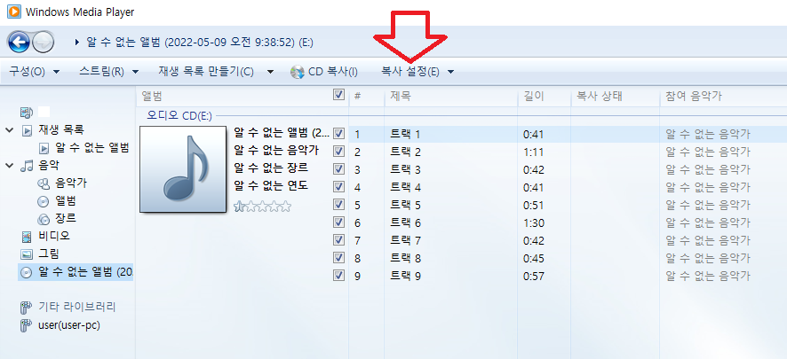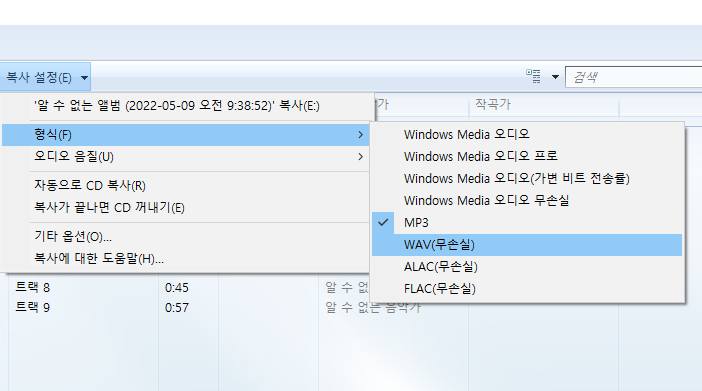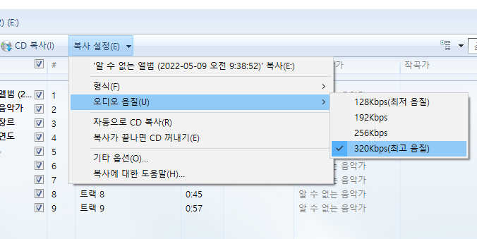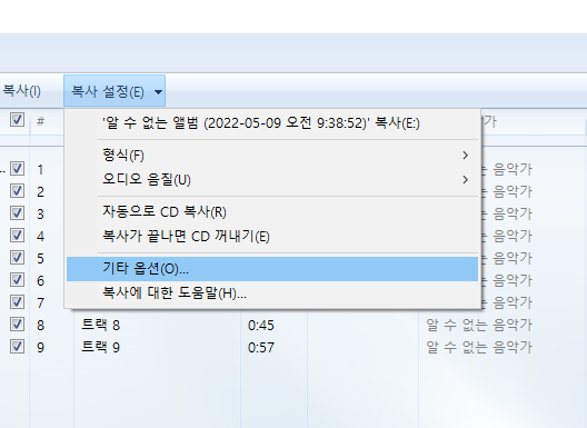 추출할 음악 cd를 cd롬에 넣고, 윈도우 미디어 플레이어를 실행하게 되면 화면 처럼 자동으로 cd 목록이 나타나게 된다. 현재 음악 시디안에 있는 음악 트랙을 확인할 수 있다. 기본적인 정보가 없다면 알 수 없는 앨범, 트랙1,2,3 형태로 나타나게 된다. 오디오 음원 무손실과 음질 설정을 위해서 아래와 같이 선택한다.