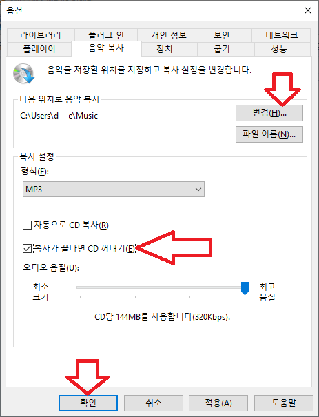 다음 위치로 음악 복사 -> 변경 선택