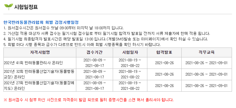 한국반려동물관리협회에서 주관하는 반려동물 온라인 관리사 자격증 시험 일정을 확인해보면 이미 2021년도 반려동물 관리자 자격증 시험일자는 종료되었다.