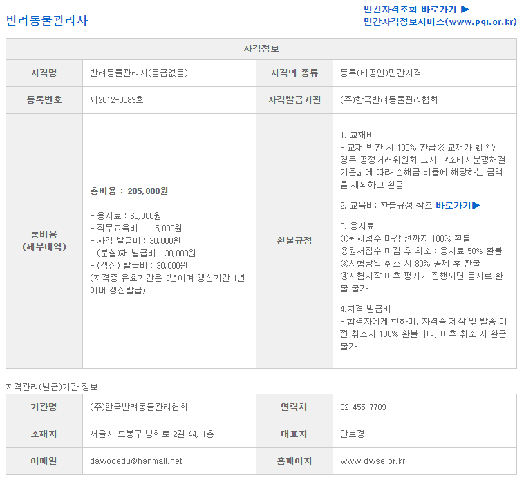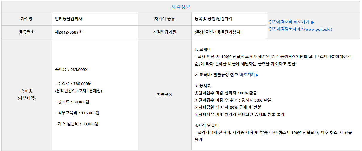 반려동물 관리사 자격증에 필요한 비용은 생각보다 비싸다. (주)한국반려동물관리협회에서 직접 응시를 할 경우 응시료, 직무교육비, 자격 발급비, 재발급비, 갱신발급비 등의 비용이 발생된다. 반려동물 관리사 자격증 취득을 위한 교재비 제외 현실적인 총 비용은 아래와 같다.