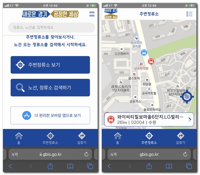 주변정류소 보기를 통해 현재 본인의 핸드폰 위치추적을 이용해서 가장 가까운 정류소를 찾아준다.
