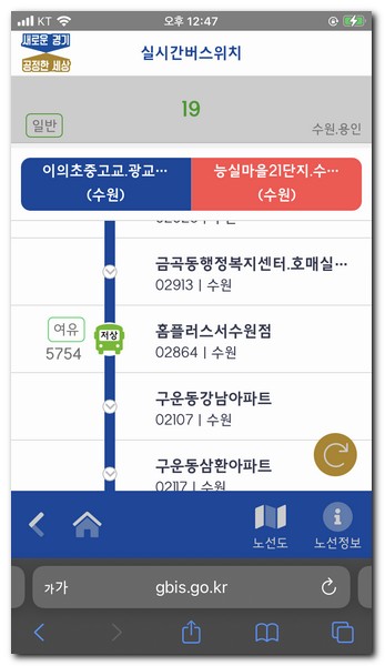 이용하려는 버스를 터치하게 되면 실시간버스위치를 확인할 수 있는데 필자가 경기19번 일반 버스를 터치해본 결과 현재 정류소위치와 언제 도착하는지 자세하게 확인할 수 있다.