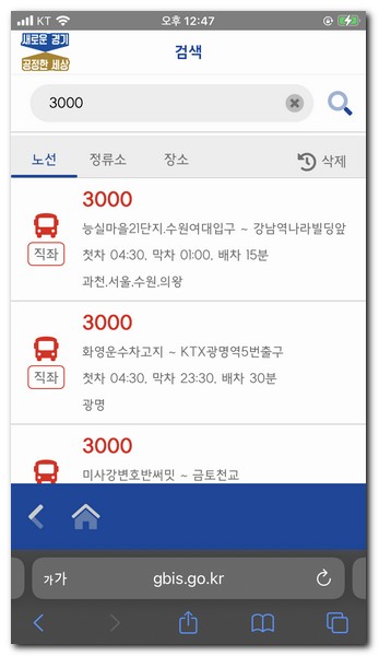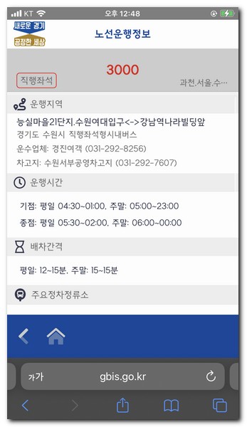 경기3000번 버스를 확인해본 결과 배차시간표도 자세히 나와 있다. 노선별, 정류소, 장소까지도 조회가 가능하다.