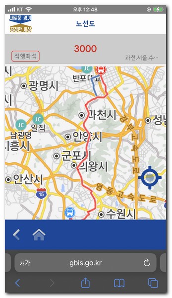 3000번 버스의 노선도를 지도를 통해서도 자세히 확인할 수 있다. 반포대교, 과천시, 안양시, 군포시, 의왕시, 수원시를 지나간다.