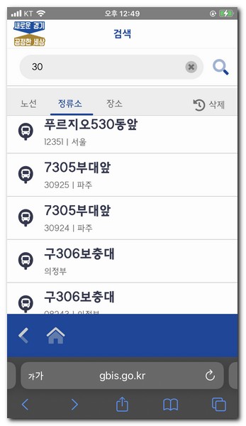 경기30번 버스노선도 확인할 수 있다. 정류소별로 푸르지오 530동앞, 7305부대앞, 구306보충대까지 이동하고 있다.