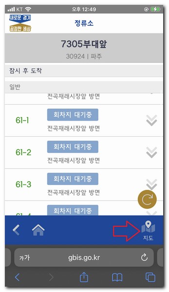 7305부대앞에는 어떤 버스가 정차하는지 정류소를 터치하면 자세히 나타난다. 61-1, 61-2, 61-3, 61-4 등의 버스가 정차하는것을 확인할 수 있다.