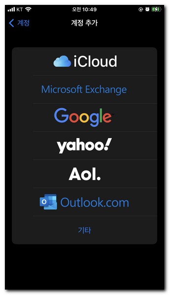 아이클라우드, 마이크로소프트 익스체인지, 구글, 야후, AoL, 아웃룩, 기타 중에 선택하면 된다.