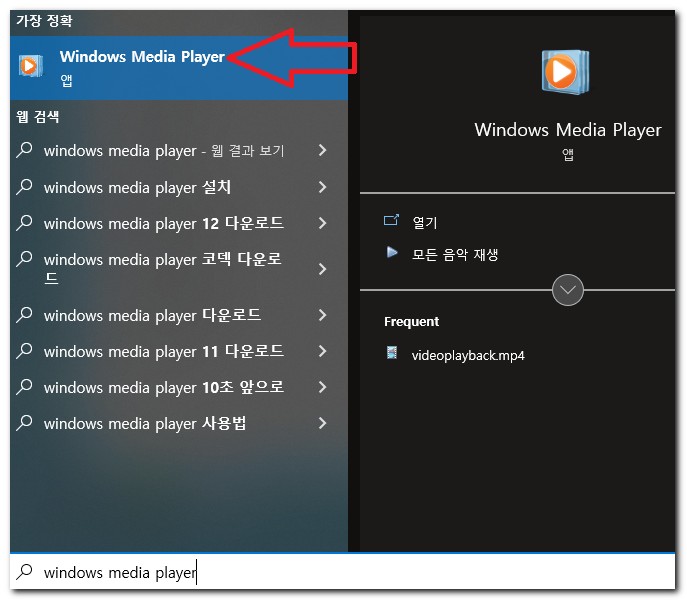가장 정확한 앱에 윈도우 미디어 플레이어가 나타나면 선택한다.