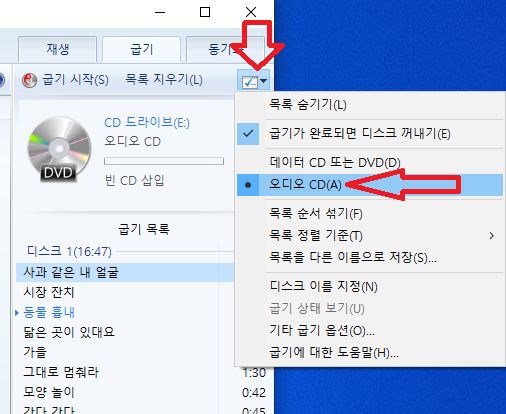 음악이 모두 추가되었다면 좌측 상단 세부설정 메뉴에서 "오디오 CD(A)"를 선택한다.