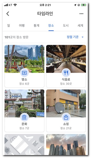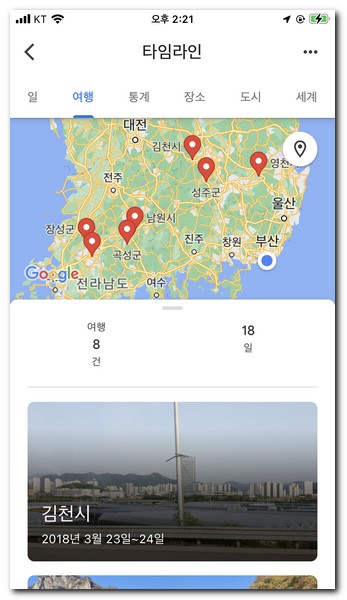 내 타임라인둘러보기를 할 수 있다. 방문한 장소와 이동한 경로를 다시 확인할 수 있게 된다. 내 타임라인은 나만 볼 수 있게 되어 있다.