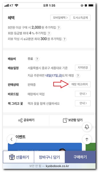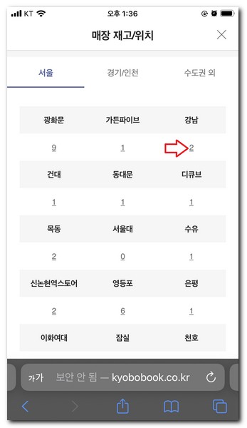 서울, 경기/인천, 수도권 외를 선택해서 각 지역별 교보문고 지점을 선택한다.