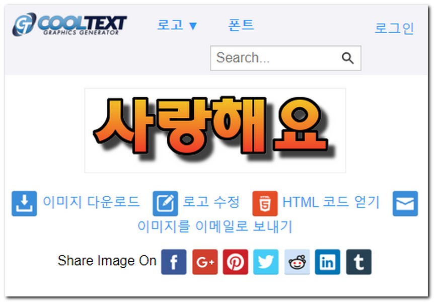 로고 제작이 완료되면 이미지 다운로드, 로고 수정, HTML 코드 얻기, 이미지를 이메일로 보내기 중에 아무거나 선택해서 다운 받으면 된다.