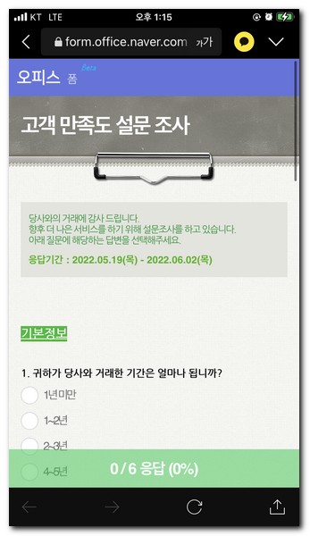 카톡에서 받은 메시지를 선택하게 되면 설문조사를 본격적으로 할 수 있게 된다.