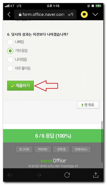모든 설문조사 내용을 작성을 완료하였다면, 제출하기 버튼을 선택한다.