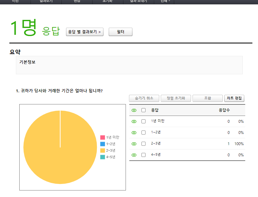 설문조사를 작성한 사용자가 문서를 제출하였다면, 관리자(설문조사 만든 사람)는 응답결과에 대해서 확인할 수 있다.