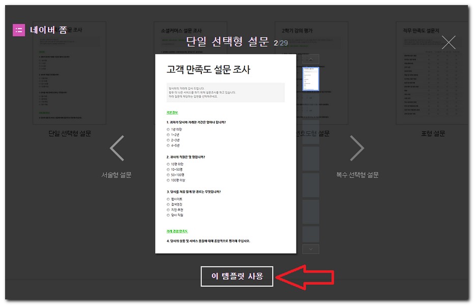 설문조사 예제를 하나 선택한 후 "이 템플릿 사용"을 선택해서 설문조사 편집을 진행한다.