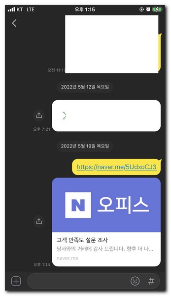 카카오톡에서 네이버 오피스에서 만들어진 설문조사에 대한 내용을 받게 된다.