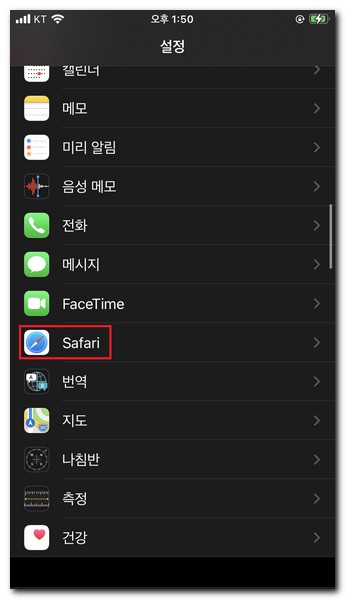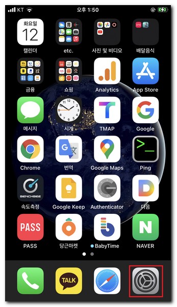 아이폰 기본 브라우저인 사파리 브라우저에서 인터넷 검색 기록 흔적을 삭제하는 방법이다. 우선 설정 메뉴를 터치한다.