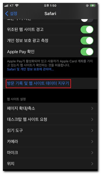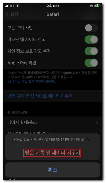 방문 기록 및 웹 사이트 데이터 지우기 버튼을 터치한다.