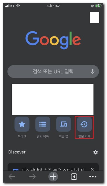 지우기 전에 현재의 방문 기록과 쿠키 및 다른 여러가지 탐색 데이터가 함께 제거된다는것을 명심하고 최종적으로 방문 기록 및 데이터 지우기 버튼을 터치한다.