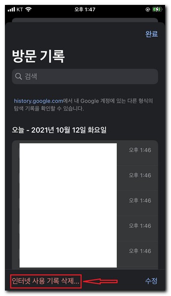 방문기록 -> 인터넷 사용 기록 삭제 터치