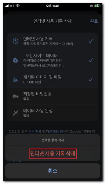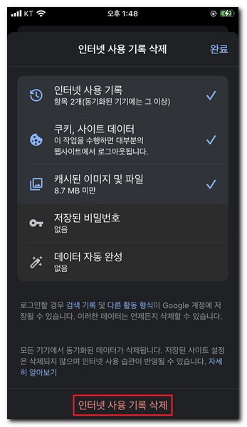 인터넷 사용기록과 쿠키, 사이트 데이터, 캐시된 이미지 및 파일을 선택해서 인터넷 사용 기록 삭제 버튼 터치