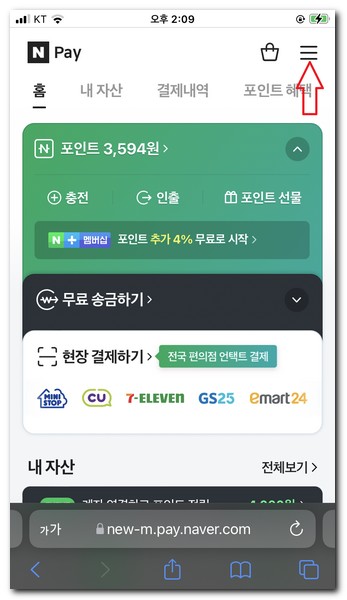 네이버에 접속하거나 네이버앱을 실행한다. 상단에 Pay 아이콘을 터치한다.