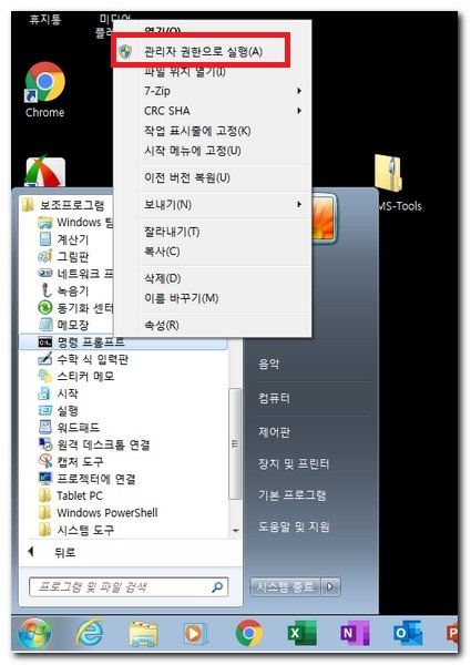 시작 메뉴 -> 모든 프로그램 -> 보조프로그램 -> 명령프롬프트 -> 마우스 오른쪽 버튼 클릭 -> 관리자 권한으로 실행