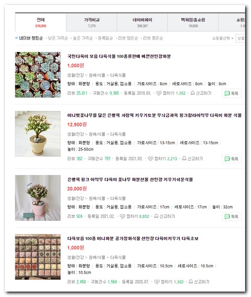 다육식물의 이름과 종류를 보다 효과적으로 찾기 위해서는 네이버 쇼핑카테고리를 이용하는것도 좋은 방법이 될 수 있다. 업체에서 다육이름고 사진을 올려놨고, 다육식물에 대한 설명도 자세히 해놓았기 때문에 골라서 보면 된다.