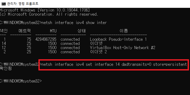 예제) netsh interface ipv4 set interface 14 dadtransmits=0 store=persistent