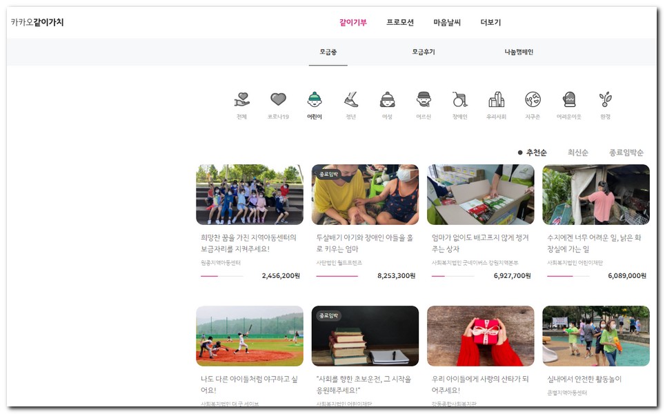 카카오같이가치라는 프로그램에서는 모금함을 별도로 제공해주고 있다. 여러가지 사연이 있는 주변에 어려운 이웃들의 이야기를 듣고 바로 기부에 참여할 수 있도록 되어 있다.