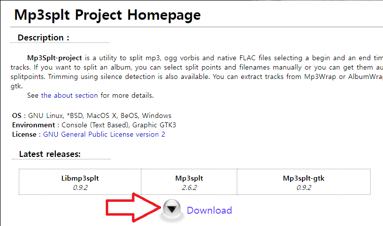 mp3splt는 오픈소스로 제작된 프로그램이며 누구나 무료로 다운로드 받을 수 있다. mp3splt 프로젝트 홈페이지에 접속한다. http://mp3splt.sourceforge.net/mp3splt_page/home.php