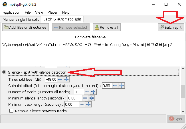 아래쪽 설정화면에서 Silence - split with silence detection를 선택해야 자동으로 트랙을 나눠준다. 몇가지 설정 파일들이 있는데 하나씩 조절하면서 쪼개는 작업을 하면 된다.