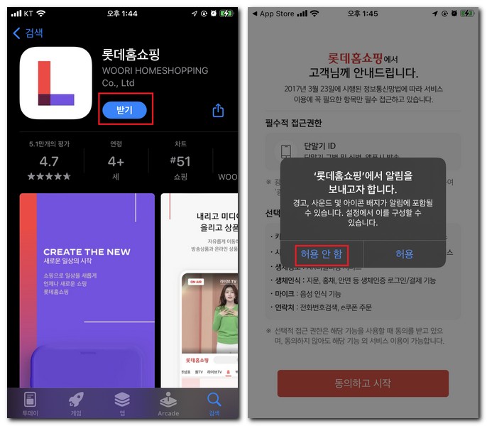 롯데홈쇼핑앱을 실행하게 되면 알림을 허용할 것인지 물어보는데, 허용 안 함을 터치한다.