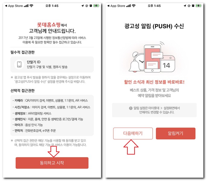 푸쉬알림 메시지도 받을 것인지 물어보는데, 다음에 하기 버튼을 터치한다. 알림설정은 마이롯데 -> 설정화면에서 변경 가능하다.