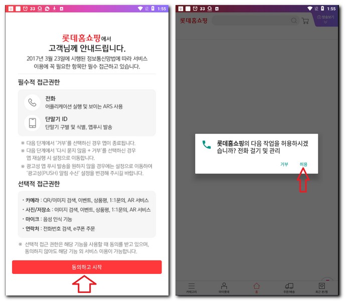 아이폰과 마찬가지로 필수접근권한과 전화걸기 및 관리 권한에 대해서 동의와 허용을 해준다.