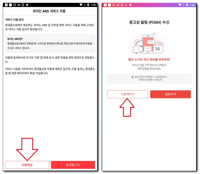 보이는 ARS 서비스 이용에 대해서 "다음에요"를 선택한다. 푸시알림 서비스도 다음에 하기로 한다.
