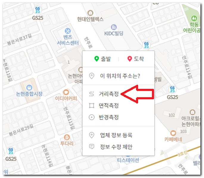 메뉴에서 찾지 않아도, 지도를 보면서 "마우스 오른쪽 버튼"을 클릭하게 되면 팝업 메뉴가 나타나게 되는데 이곳에서 "거리측정"을 선택한다.