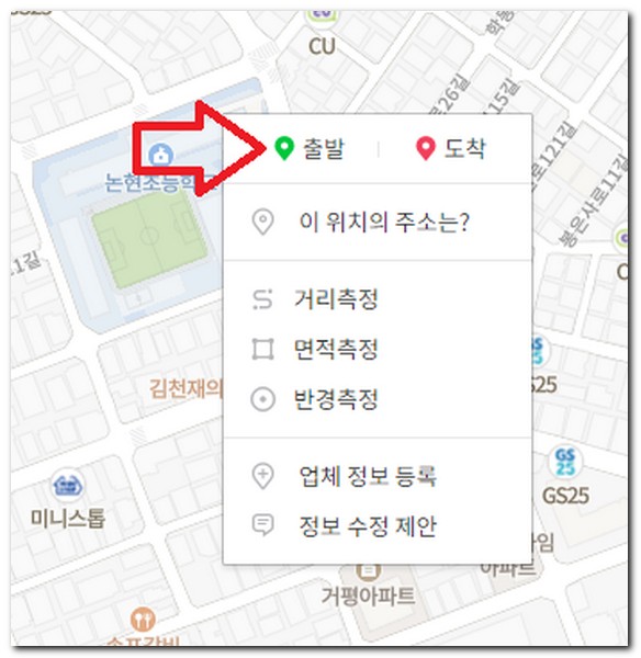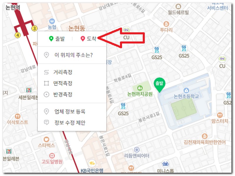 그리고 목적지를 선택하기 위해 지도에서 목적지 위치에서 "마우스 오른쪽 버튼"을 클릭하고 "도착" 아이콘을 선택한다.