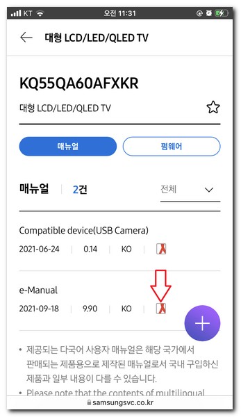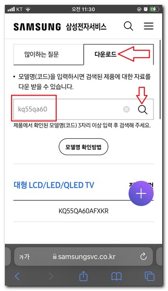 필자의 삼성 tv 모델명은 KQ55QA60AFXKR 인데, KQ55QA60 까지만 입력해도 관련된 제품이 검색 된다.