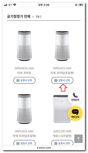 제품검색에서 모델명이나 제품이름을 입력해 주거나 공기청정기 사진을 선택해준다.
