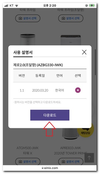 필자는 제로2.0(조달향) azbg330-iwk모델을 선택하였다. 다운로드 버튼을 터치한다.