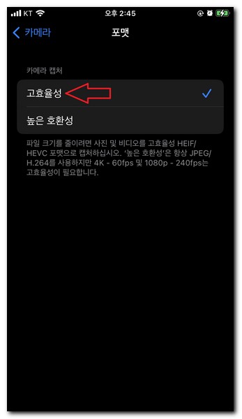 이렇게 되면 파일 크기를 줄일 수 있는데, 고효율성은 hevc 동영상 포맷방식으로 저장된다. 반대로 높은 화질로 저장하기 위해서는 H.264포맷으로 선택하면 된다.