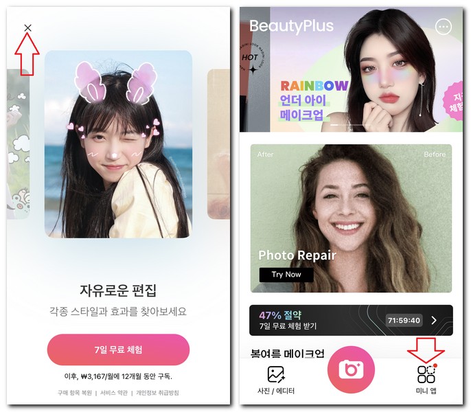 그리고 마지막 화면에서 "무료 사용 및 구독"을 눌리면 안되고, 좌측 상단에 X 자 표시를 확인할 수 있다.