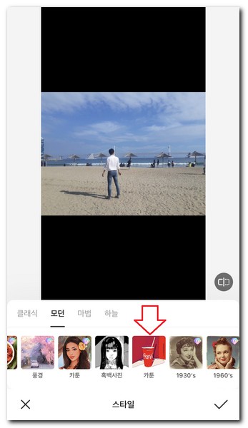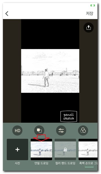 만화로 만들 사진을 선택한 후에 아래쪽에 연필 드로잉 컬러 핸드 드로잉 등 다양한 드로잉 방식들을 선택할 수 있다.