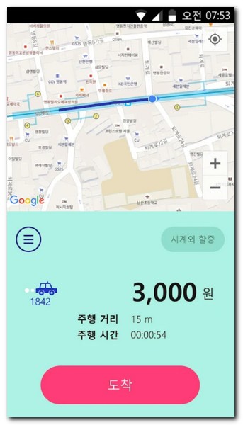 출발 버튼을 터치하고 도착지까지 주행거리와 주행시간을 측정해서 기본요금인지 아니면 추가요금이 붙었는지 세부적으로 확인할 수 있다. 도착을 하게 되면 꼭 도착 버튼을 터치해야된다.