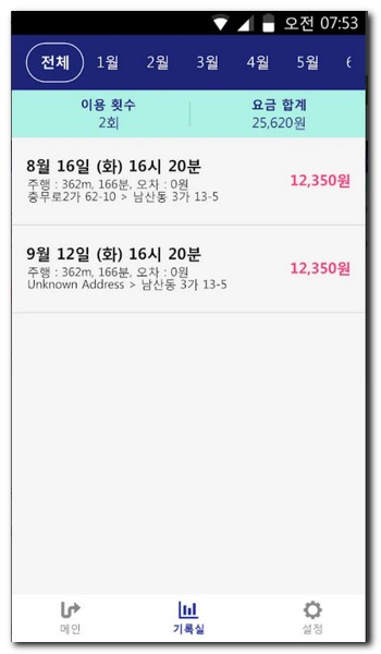 하단 메뉴에 기록실이라고 보이는데, 현재까지 내가 이용한 택시 요금표를 정확히 확인할 수 있다. 출발지와 도착지에 대해서도 자세히 나와 있으며 경과된 시간과 택시요금까지 상세히 확인할 수 있다.