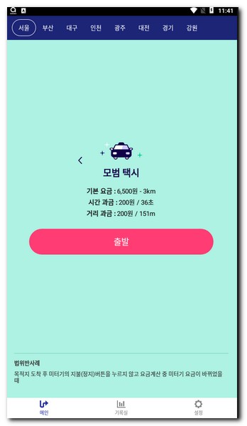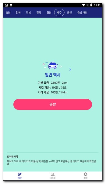 상단 메뉴에는 서울, 부산, 대구, 인천, 광주, 대전, 경기, 강원, 제주, 경남, 경북, 전남, 전북 등 우리나라 대부분의 지역별 택시요금표를 확인할 수 있고 지역을 선택한 후 출발 버튼을 터치한다.