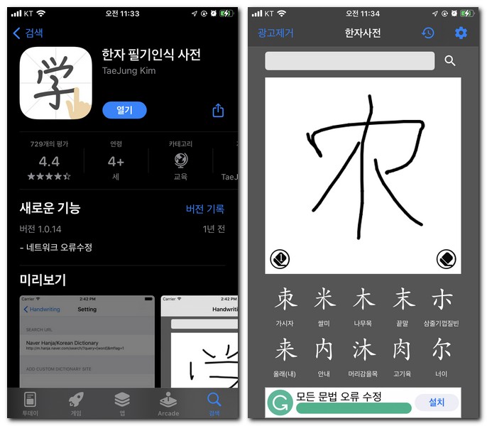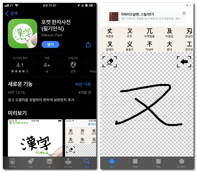 2) 포켓 한자사전(필기인식)